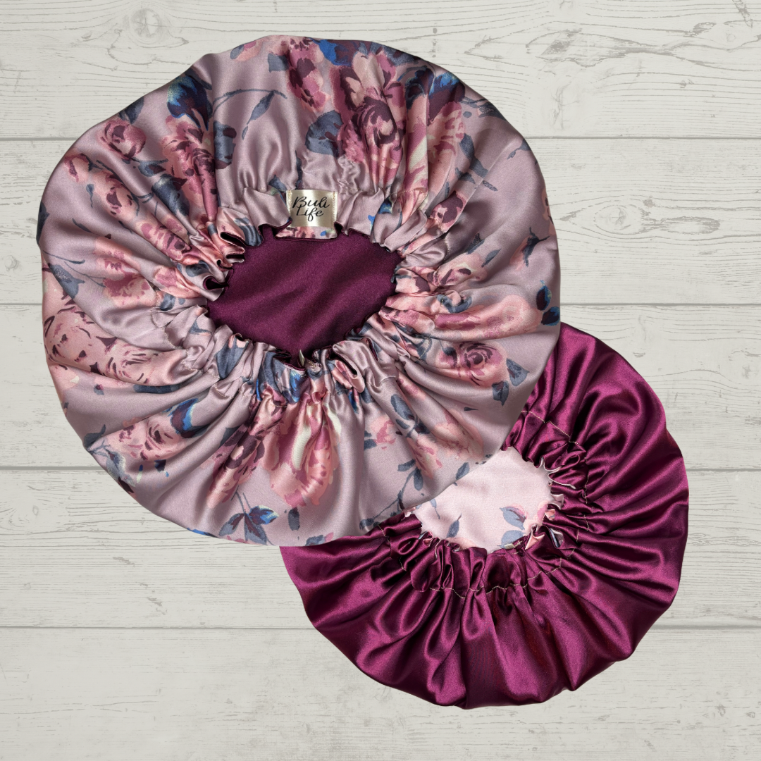 Reversible satin bonnet that can be worn on either side! Keeps hair from drying, frizzing, and breaking while also holding in moisture during sleep! There are multiple color variations to meet the needs of every personality!