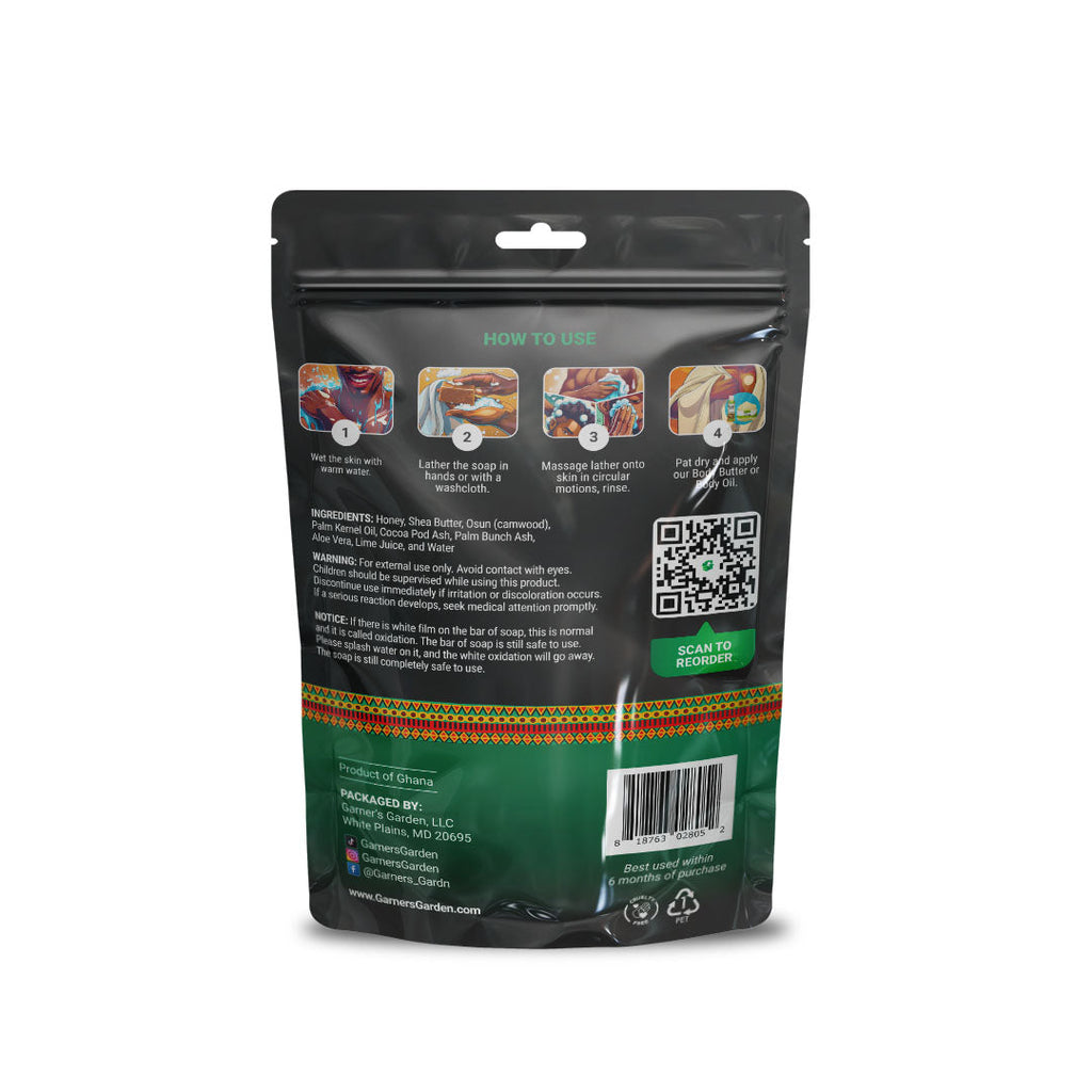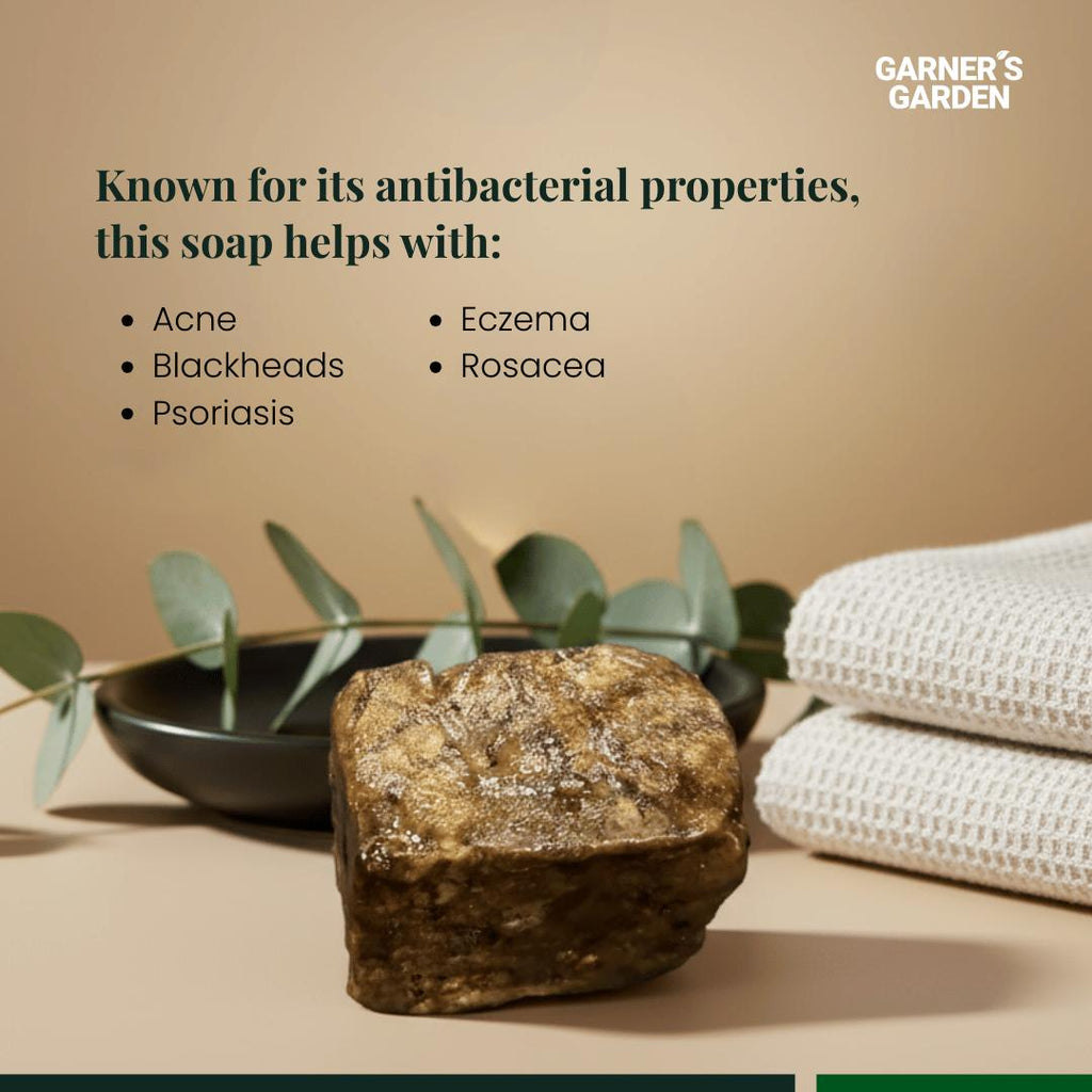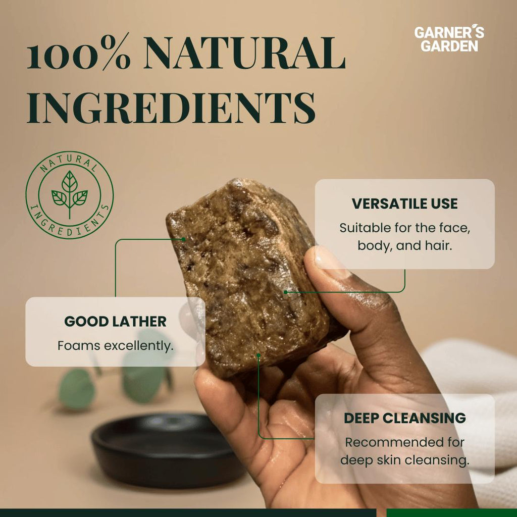 Garner's Garden Raw African Black Soap is an authentic, all-natural bar cleanser sourced directly from Ghana. It is formulated using a traditional recipe of roasted cocoa pods, plantain skins, and raw shea butter. This multi-purpose soap functions as a deep-pore facial cleanser and a clarifying body wash. Its primary purpose is to detoxify the skin, manage acne, soothe inflammatory conditions like eczema and psoriasis, and reduce the appearance of hyperpigmentation. The formula is 100% natural, unrefined, and free from synthetic additives, making it a potent solution for oily, combination, and blemish-prone skin types.