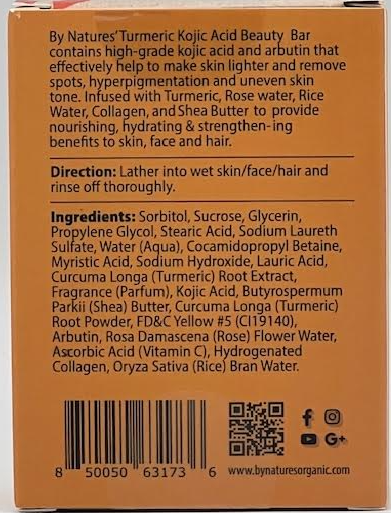By Natures Turmeric Kojic acid Beauty bar contains high grade kojic acid and arbutin that effectively help to make skin lighter and remove spots, hyperpigmentation and uneven skin tone. Infused with Turmeric, rose Water, Rice Water, Collagen, and Shea Butter to provide nourighing, hydrating & strengthening benefits to skin, face and hair.
