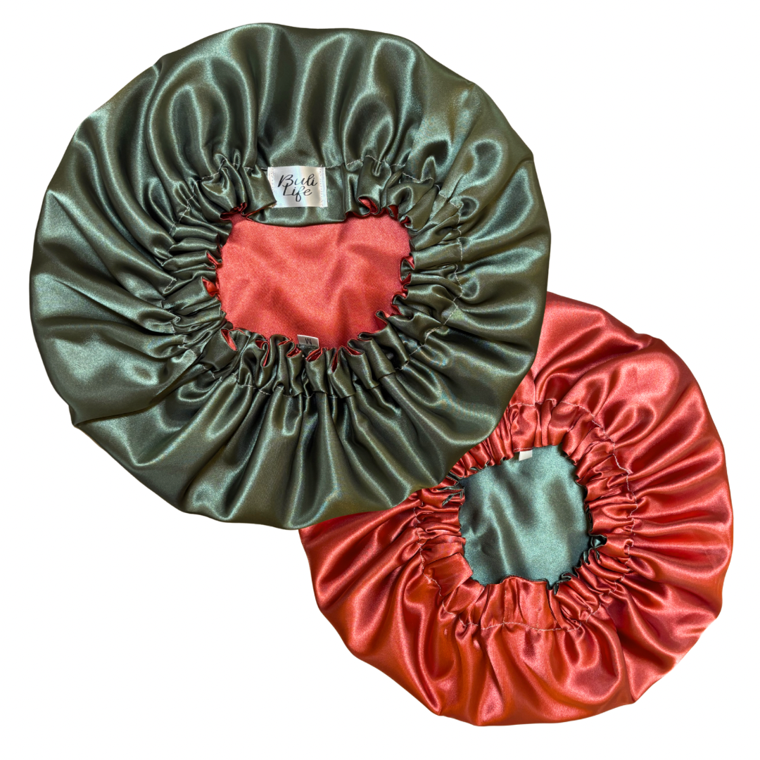 Reversible satin bonnet that can be worn on either side! Keeps hair from drying, frizzing, and breaking while also holding in moisture during sleep! There are multiple color variations to meet the needs of every personality!