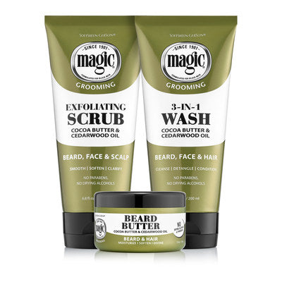 Magic Grooming Beard Butter for black men helps to moisturize, soften and define your beard and hair to achieve a perfectly groomed look without compromising style or comfort.