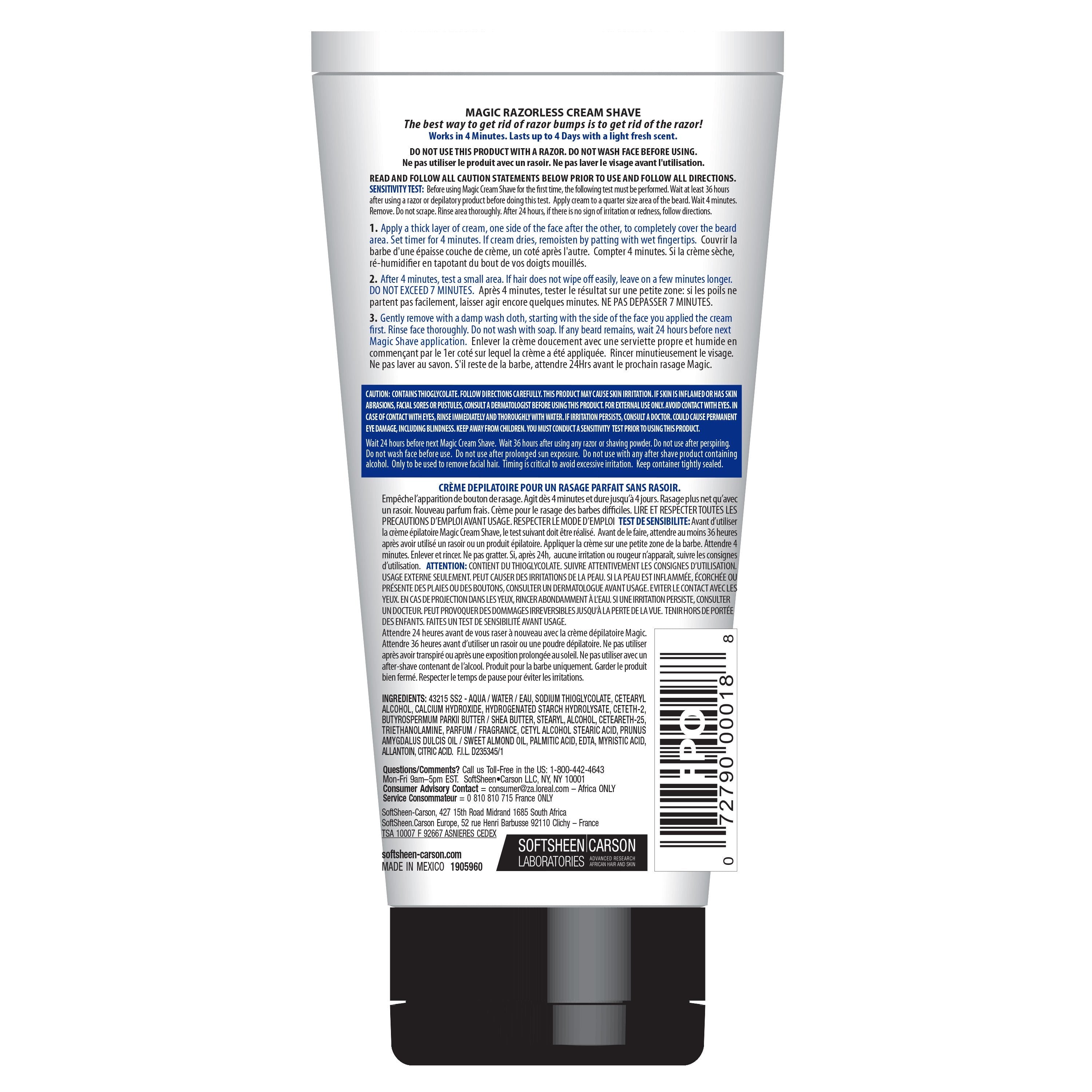 SENSITIVITY TEST : Before using Magic Cream Shave for the first time, the following test must be performed. Wait at least 36 hours after using a razor or depilatory product before doing this test. Apply cream to a quarter size area of the beard Wait 4 minutes before removing. Do not scrape. Rinse area thoroughly. After 24 hours, if there is no sign of irritation or redness follow directions on product.